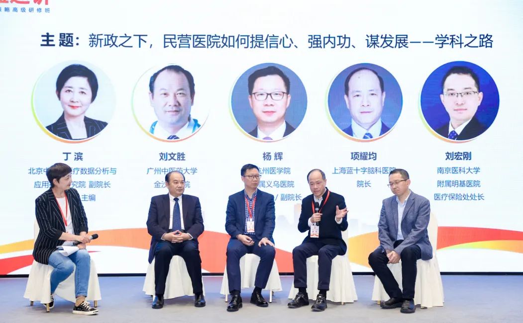 本次活动特别设置了主题为“新政之下,民营医院如何提信心、强内功、谋发展——学科之路”的对话交流环节,该环节主持人是北京中卫云医疗数据分析与应用技术研究院副院长、品质医疗主编丁滨,杭州医学院附属义乌医院党委书记/副院长杨辉、广州中医药大学金沙洲医院院长刘文胜、上海蓝十字脑科医院院长项耀均、南京医科大学附属明基医院医保办主任刘宏刚参与了对话交流,四位嘉宾就民营医院临床重点专科建设等话题进行思维碰撞,分享了新阶段对行业发展的独特见解,同时与台下参会者进行了热烈的讨论与互动。