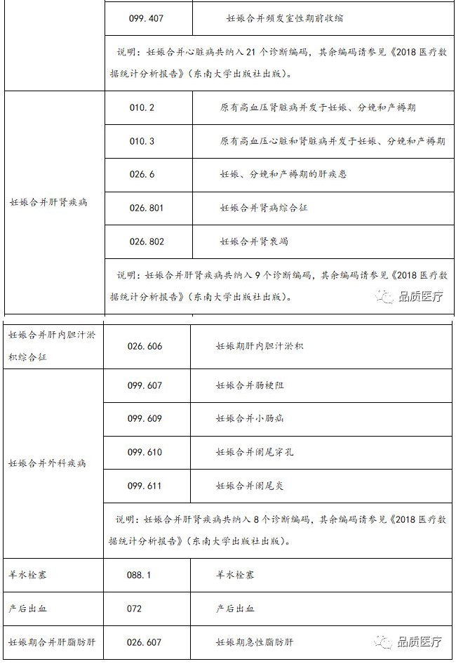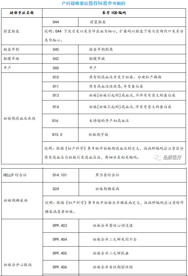 《三级综合医院医疗服务能力指南(2016年版)》中制定的产科疑难重症共14个。北京中卫云医疗数据分析与应用技术研究院在对类目、亚目编码的基础上,对目前使用较多的4个版本的扩展码分别进行编码,参考了各专科最新的权威性专著及相关临床指南、共识等,部分在临床专家指导下,来界定每个疾病的定义与范围,提供国标版编码供参考。